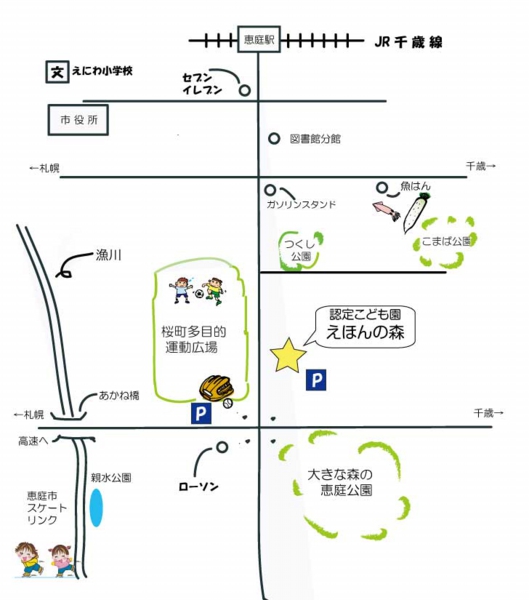 【JRの方・恵庭駅から】JR恵庭駅で下車駅からの距離:1.5km(徒歩で約18分)恵庭駅通り→道道1021号線を柏木戸磯通に向かって南西にお進みください【お車の方・高速道路から】恵庭ICからの距離:2.7km道道117号線を左折する美咲野1・美咲野4(交差点)を右折して市役所通に入る桜町3・白樺町1(交差点)を左折して恵庭駅通に入る